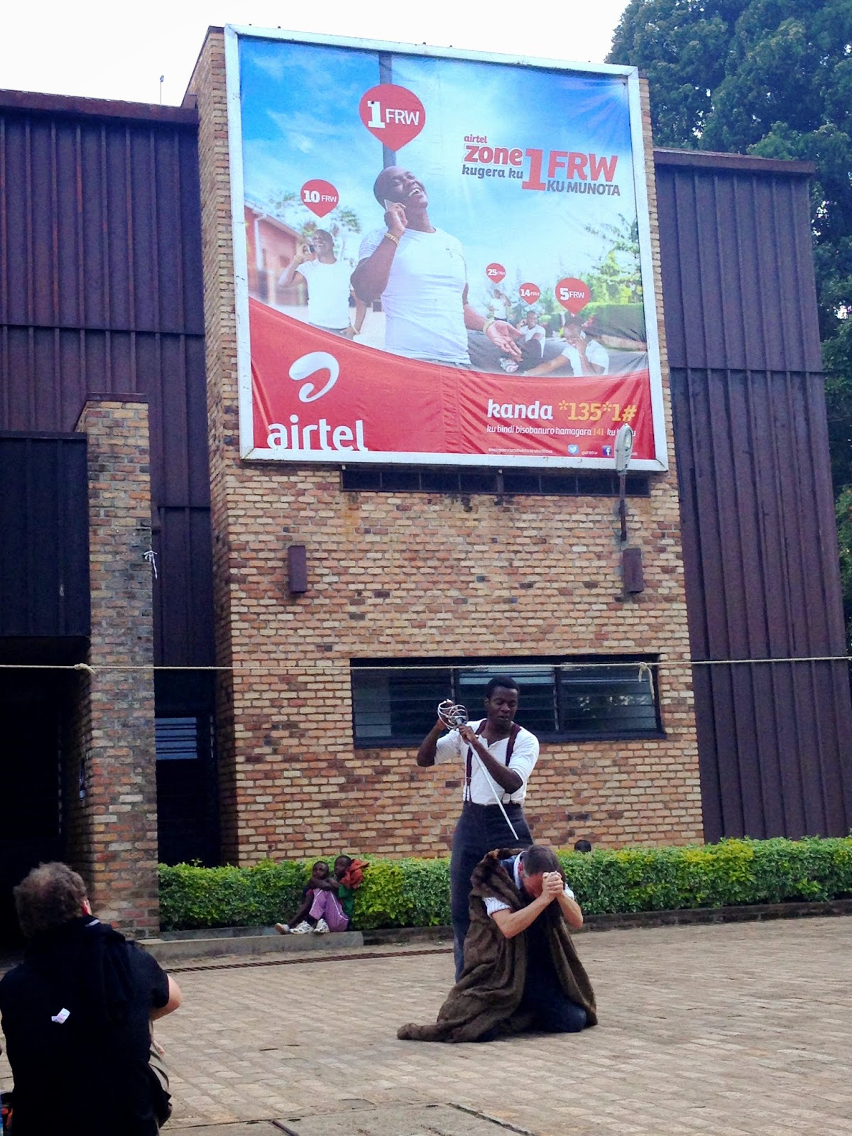 But, when we were there was going to be a production of Hamlet, we were ecstatic. If you haven't figured it out, there isn't a lot of culture in the sense of the fine arts in Butare. I think it was Stacey or Tiffany who first texted the group asking who wanted to go. I didn't research the event much but figured it would be a nice Saturday afternoon activity. I arrived at the University thinking it was going to be a University production. Boy was I wrong. Apparently, there is a British troupe of actors from the Globe Theatre in London who are part of what is called Globe to Globe. They are performing a 2 year tour around the world of Hamlet... EVERY SINGLE COUNTRY has a performance. They actually did a performance at the Folgers Shakespeare Library last July in DC and I suspect that a few people I know went to the performance (Emily?). I hadn't seen or read Hamlet since high school and actually was thinking that my high school Shakespeare teacher, Ms. Ward would be very disappointed that I couldn't even reiterate the story when someone asked me. Fortunately for Wikipedia, I was able to remind myself of the storyline.
